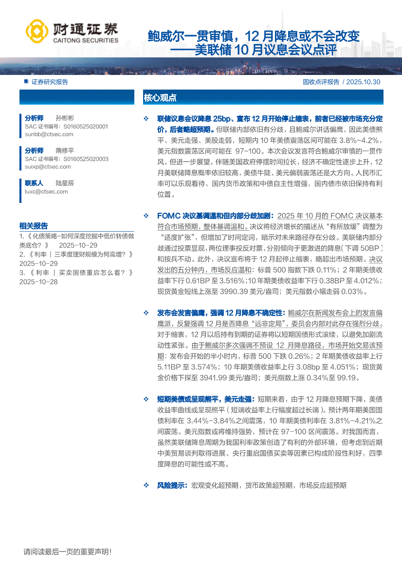 研报:财通证券-美联储10月议息会议点评:鲍威尔一贯审慎,12月降息或不会改变-251030