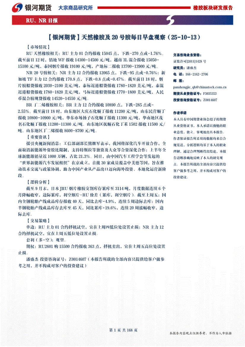 研报:银河期货-天然橡胶及20号胶每日早盘观察-251013