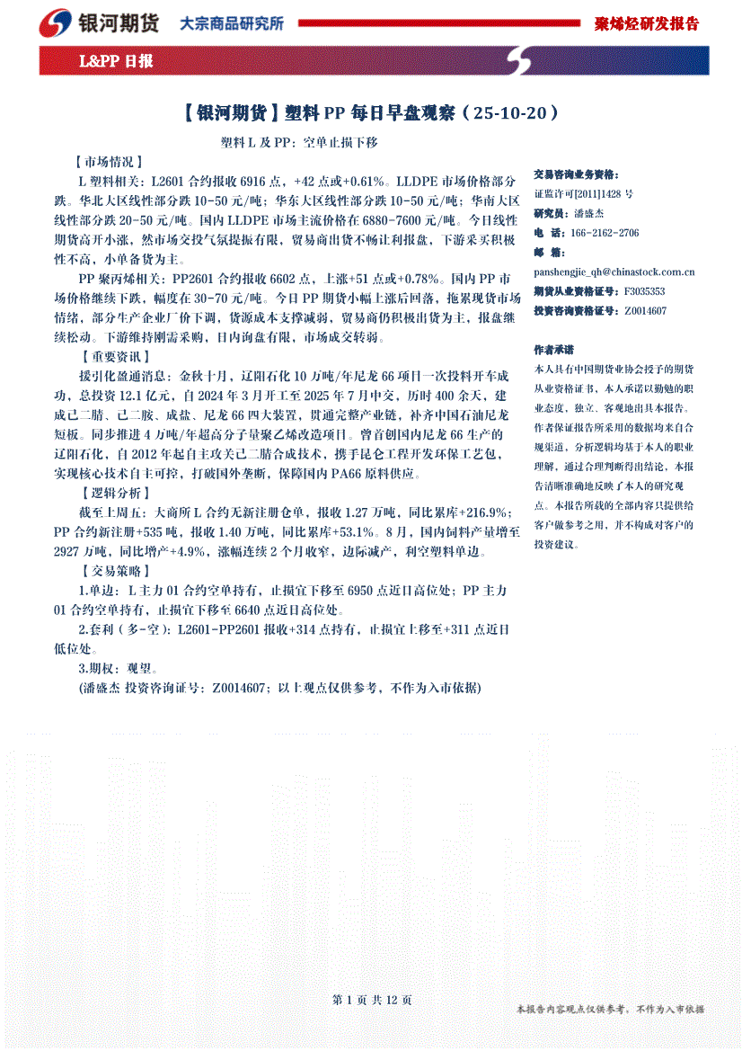研报:银河期货-塑料PP每日早盘观察-251020