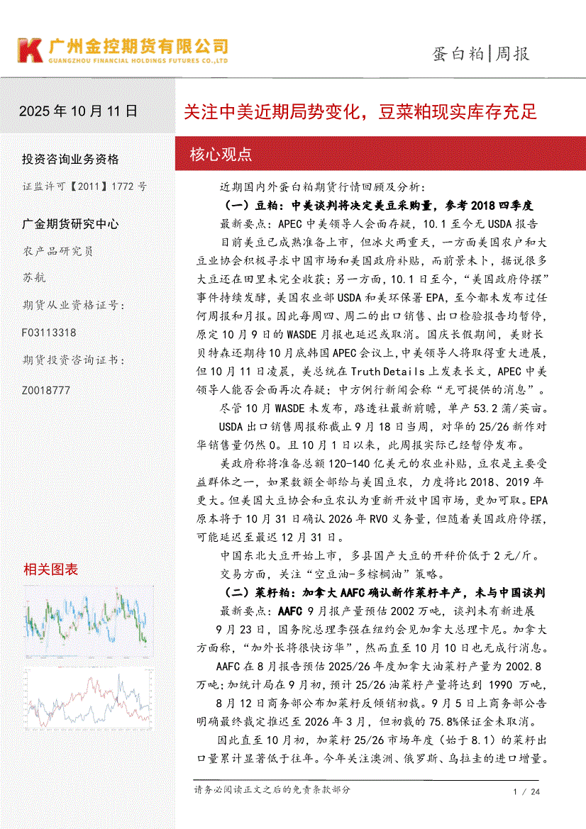 研报:广金期货-蛋白粕周报:关注中美近期局势变化,豆菜粕现实库存充足-251011