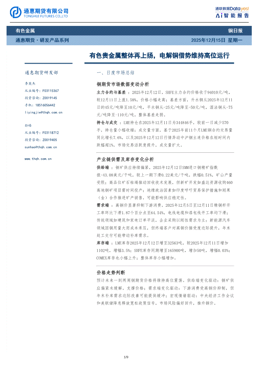研报:通惠期货-铜日报:有色贵金属整体再上扬,电解铜借势维持高位运行-251215