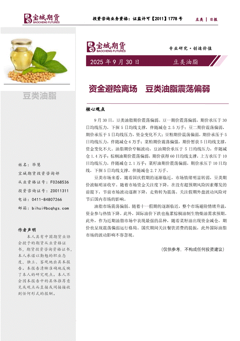 研报:宝城期货-豆类油脂日报:资金避险离场,豆类油脂震荡偏弱-250930