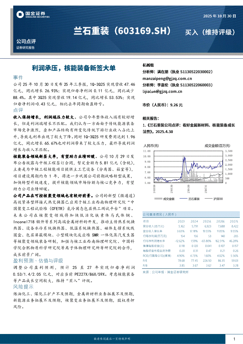 兰石重装研报:国金证券-兰石重装-603169-利润承压,核能装备新签大单-251030
