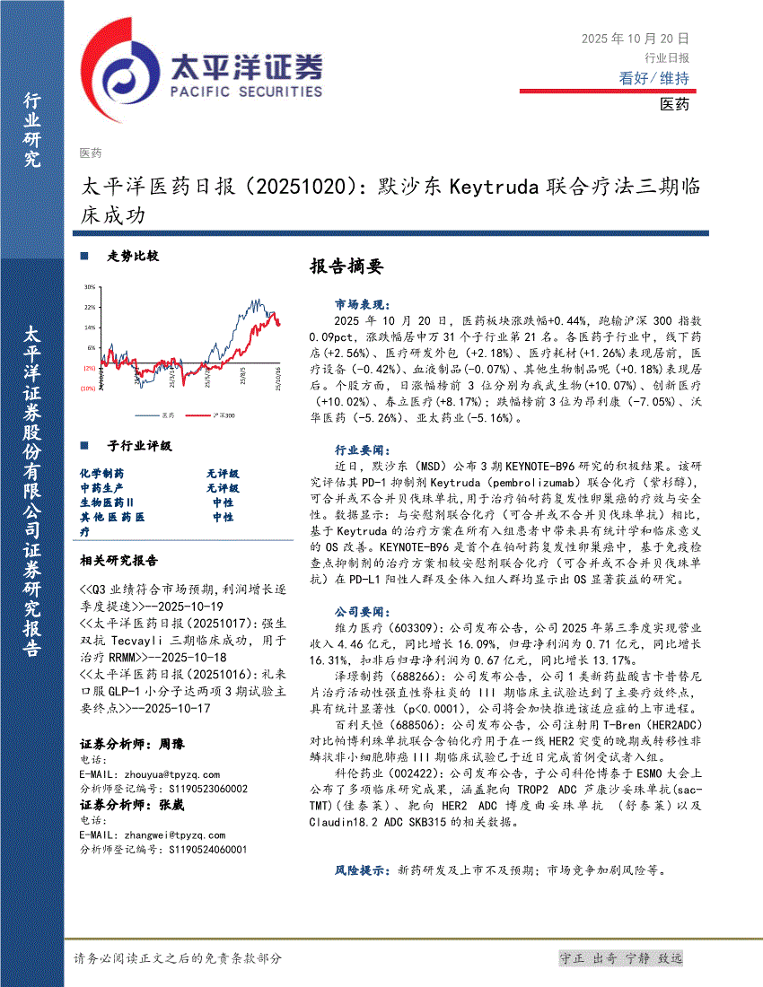 医药行业研报:太平洋证券-医药行业日报:默沙东Keytruda联合疗法三期临床成功-251020