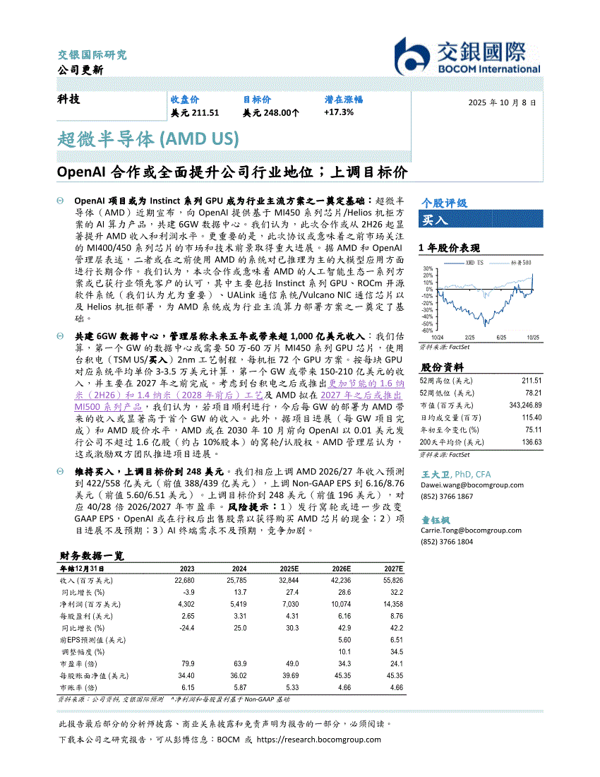 超威半导体研报:交银国际-超威半导体-AMD.US-OpenAI合作或全面提升公司行业地位;上调目标价-251008