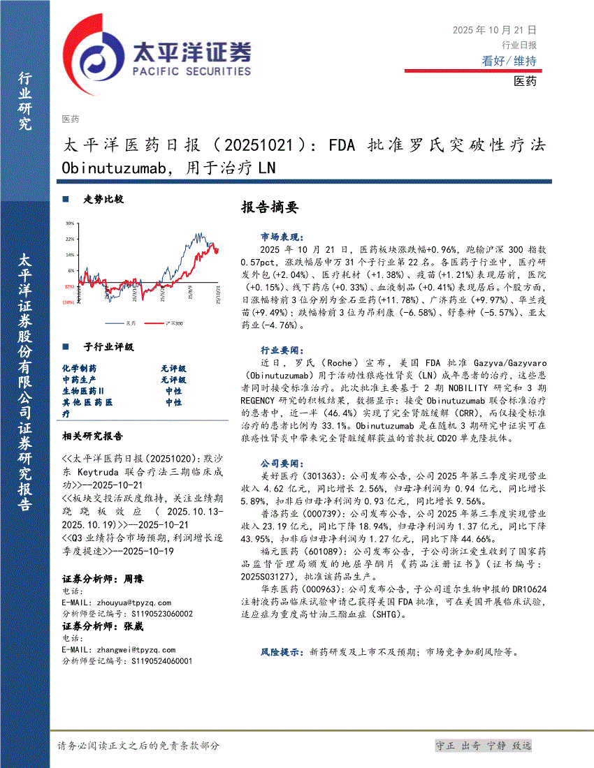 太平洋证券-医药行业日报:FDA批准罗氏突破性疗法Obinutuzumab,用于治疗LN-251021