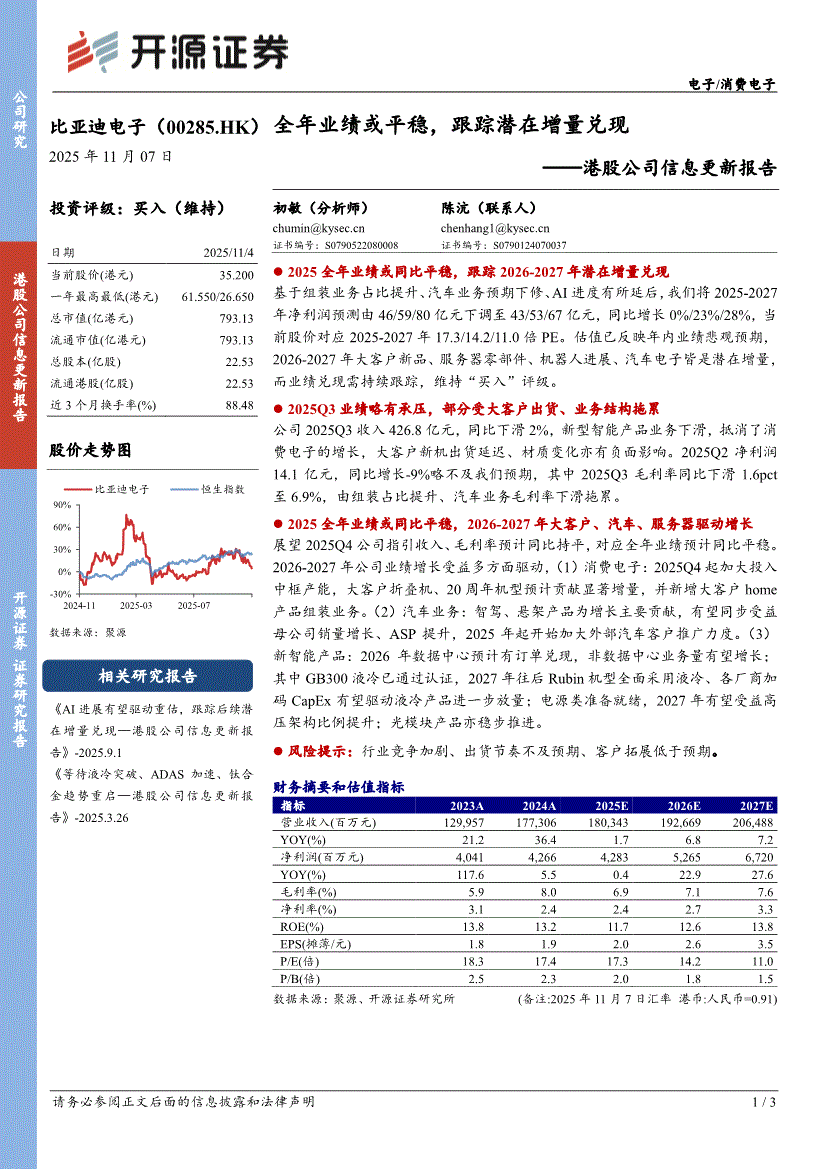比亚迪电子研报:开源证券-比亚迪电子-0285.HK-港股公司信息更新报告:全年业绩或平稳,跟踪潜在增量兑现-251107