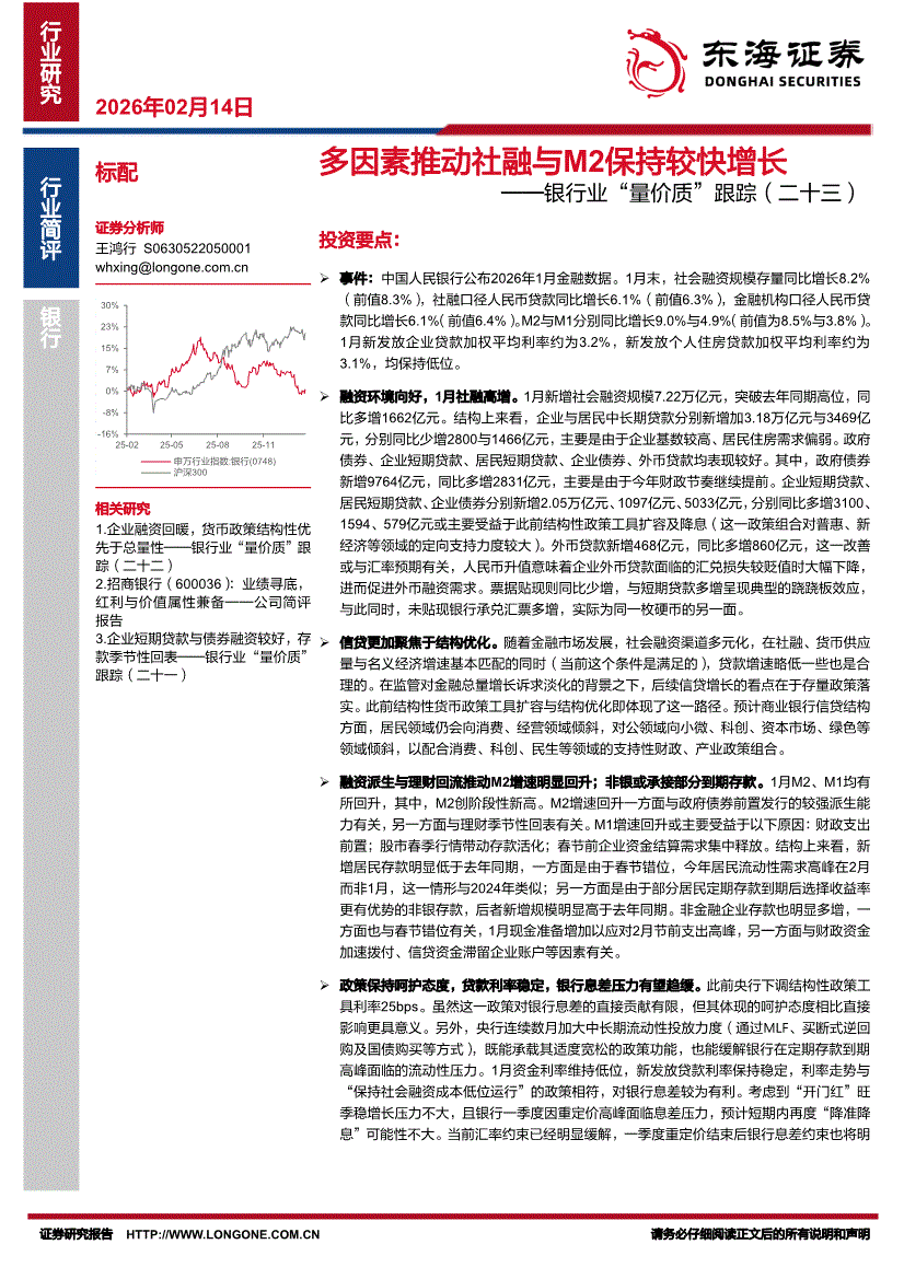 银行业研报:东海证券-银行“量价质“跟踪(二十三):多因素推动社融与M2保持较快增长-260214