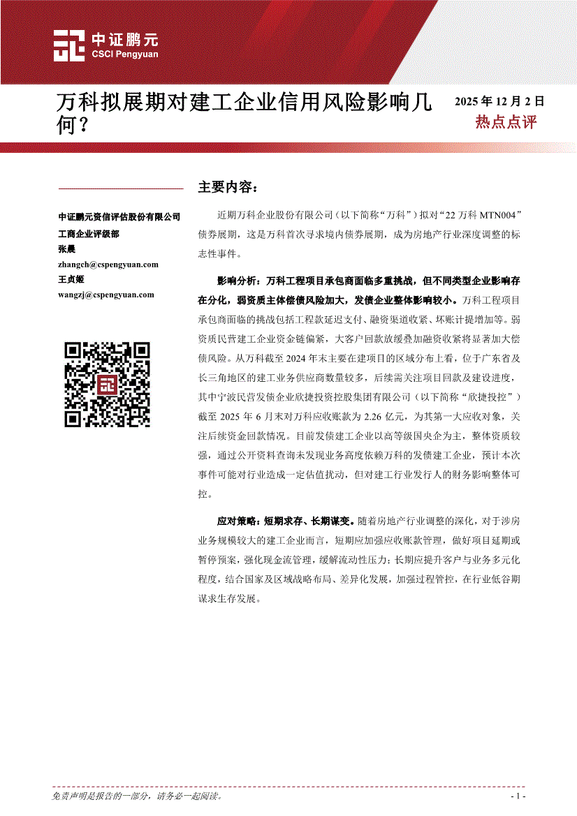 研报:中证鹏元资信评估股份有限公司-万科拟展期对建工企业信用风险影响几何?-251202