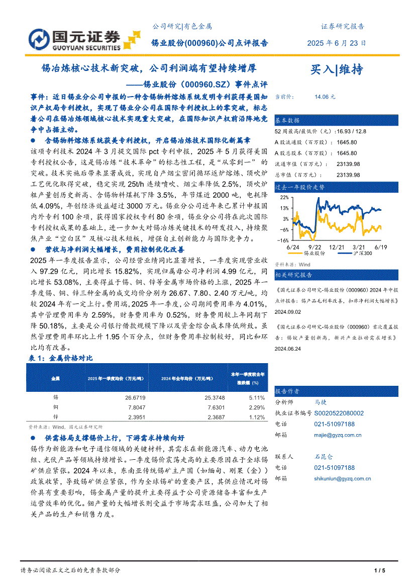锡业股份研报:国元证券-锡业股份-000960-事件点评:锡冶炼核心技术新突破,公司利润端有望持续增厚-250623