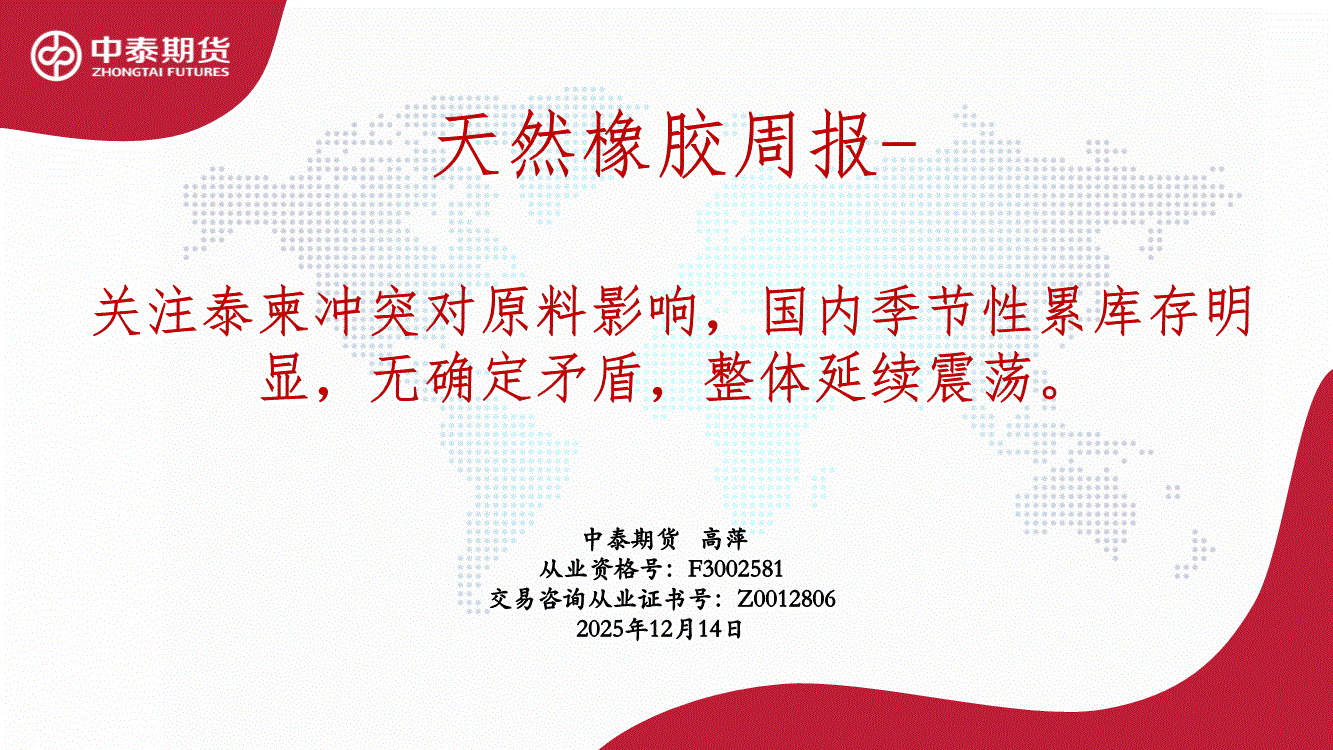 研报:中泰期货-天然橡胶周报:关注泰柬冲突对原料影响,国内季节性累库存明显,无确定矛盾,整体延续震荡。-251214