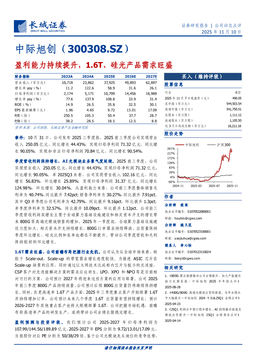 中际旭创研报:长城证券-中际旭创-300308-盈利能力持续提升,1.6T、硅光产品需求旺盛-251110