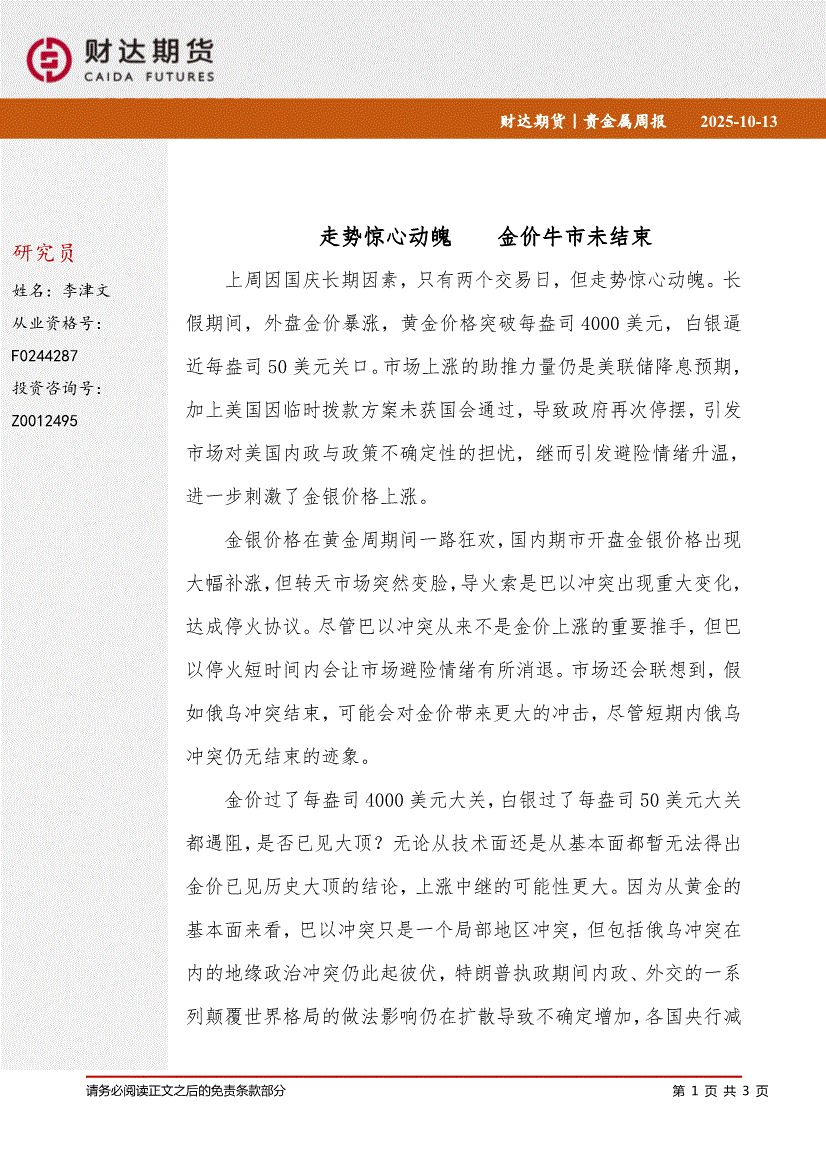 研报:财达期货-贵金属周报:走势惊心动魄,金价牛市未结束-251013