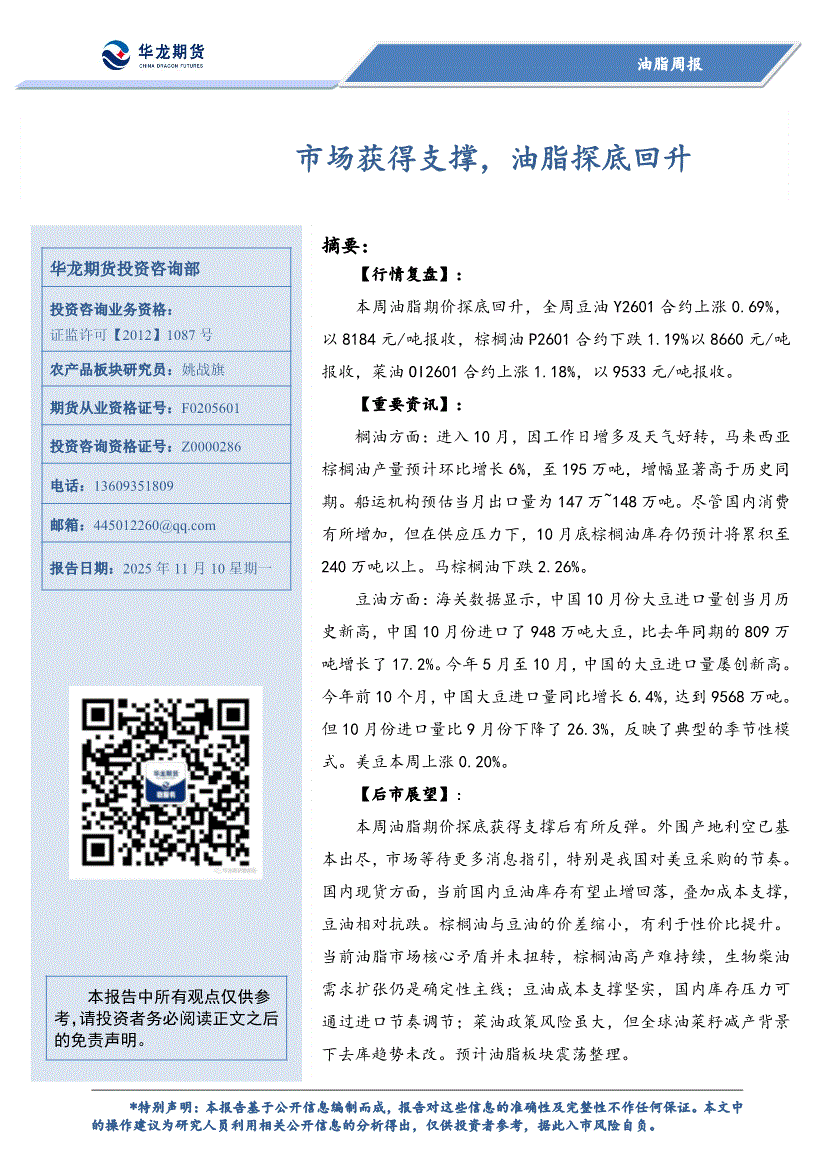研报:华龙期货-油脂周报:市场获得支撑,油脂探底回升-251110