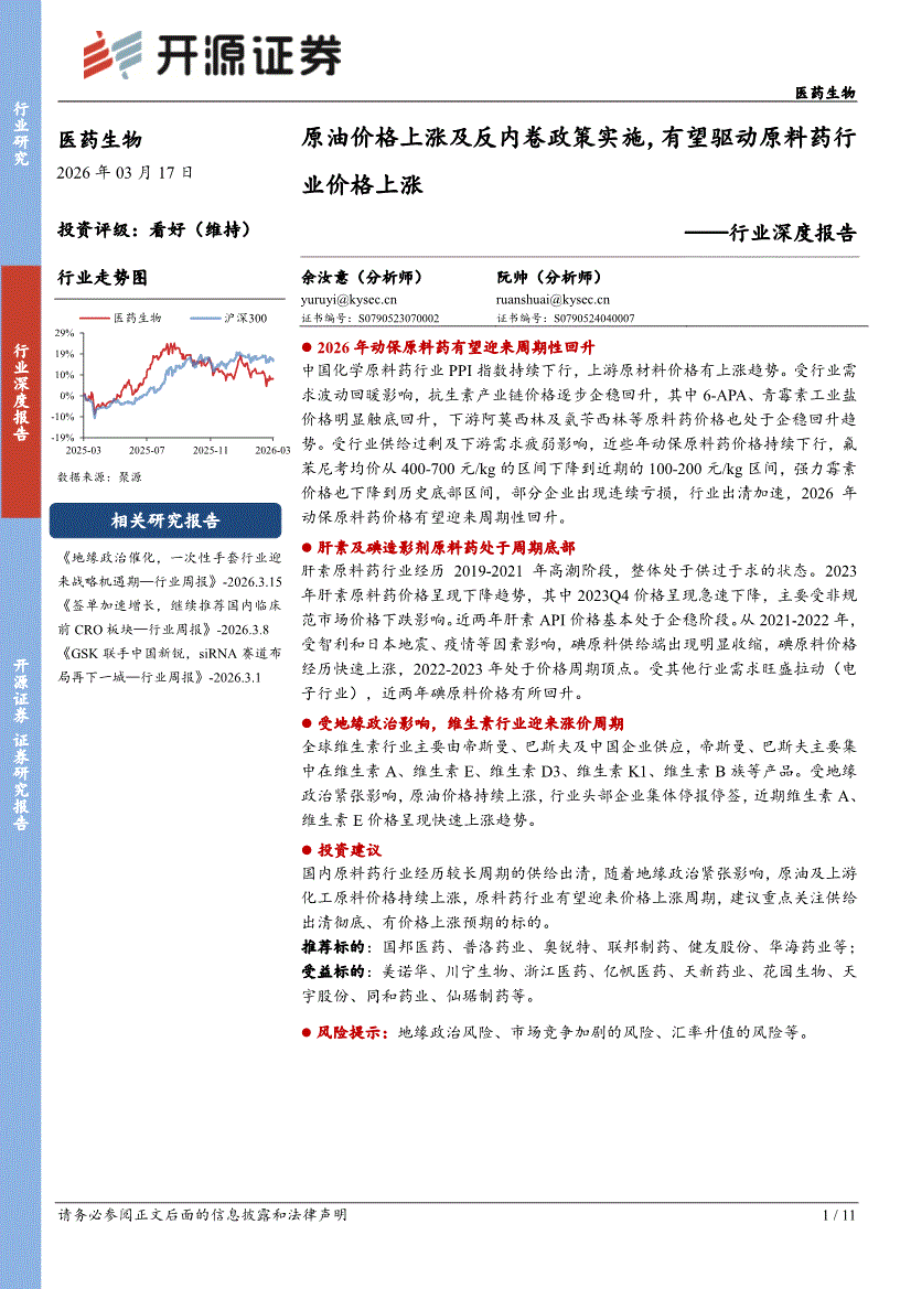 医药生物行业研报:开源证券-医药生物行业深度报告:原油价格上涨及反内卷政策实施,有望驱动原料药行业价格上涨-260317