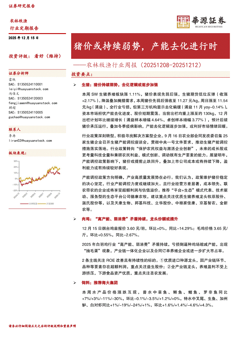 农林牧渔行业研报:华源证券-农林牧渔行业周报:猪价或持续弱势,产能去化进行时-251215